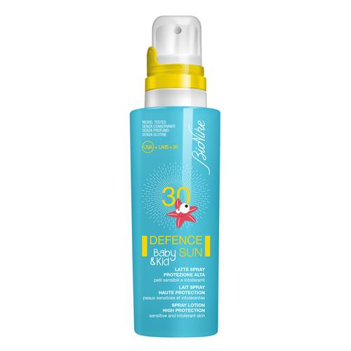 BioNike DEFENCE baby SUN 30 Latte solare SPF30 (protezione alta) specifico per la pelle delicata e vulnerabile di neonati e bambini durante l’esposizione al sole. Studiato per mantenere i filtri sulla superficie della pelle, garantisce protezione uniforme e ad ampio spettro (UVA-UVB). Lo speciale Raksaa Complex aiuta a prevenire i danni da radicali liberi, rinforza i naturali meccanismi di difesa della pelle favorendone il graduale adattamento al sole. Prodotto altamente tollerabile, senza glutine, profumo e conservanti; testato per il nichel. Resistente all’acqua.