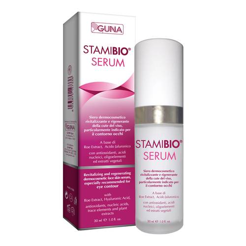 GUNA STAMIBIO SERUM Siero dermocosmetico rivitalizzante, antiossidante e rigenerante della cute del viso, particolarmente indicato per il contorno occhi: agisce su borse, occhiaie e rughe, conferendo proprietà di resistenza ed elasticità cutanea.